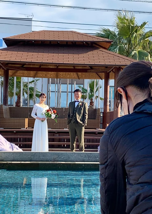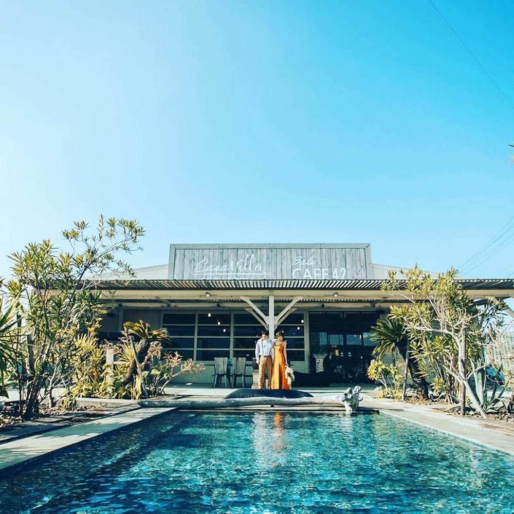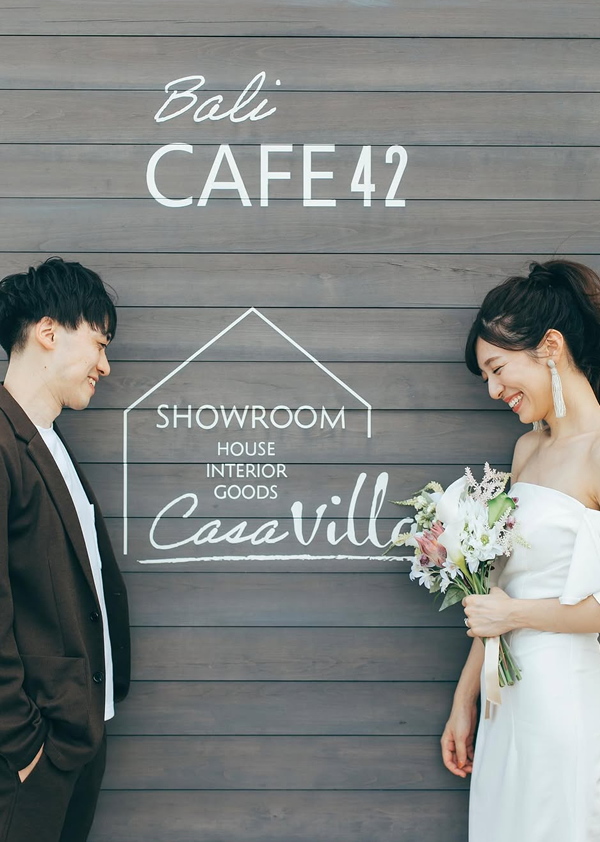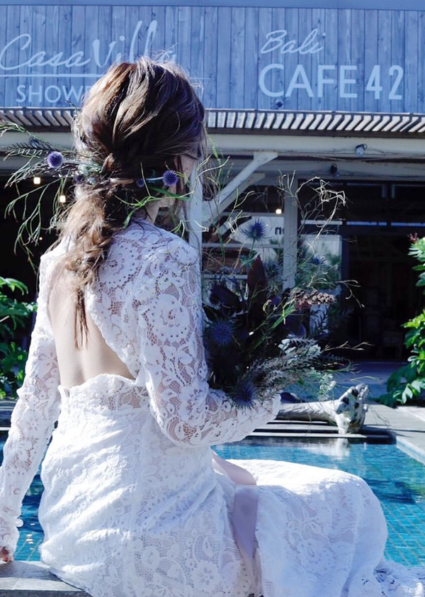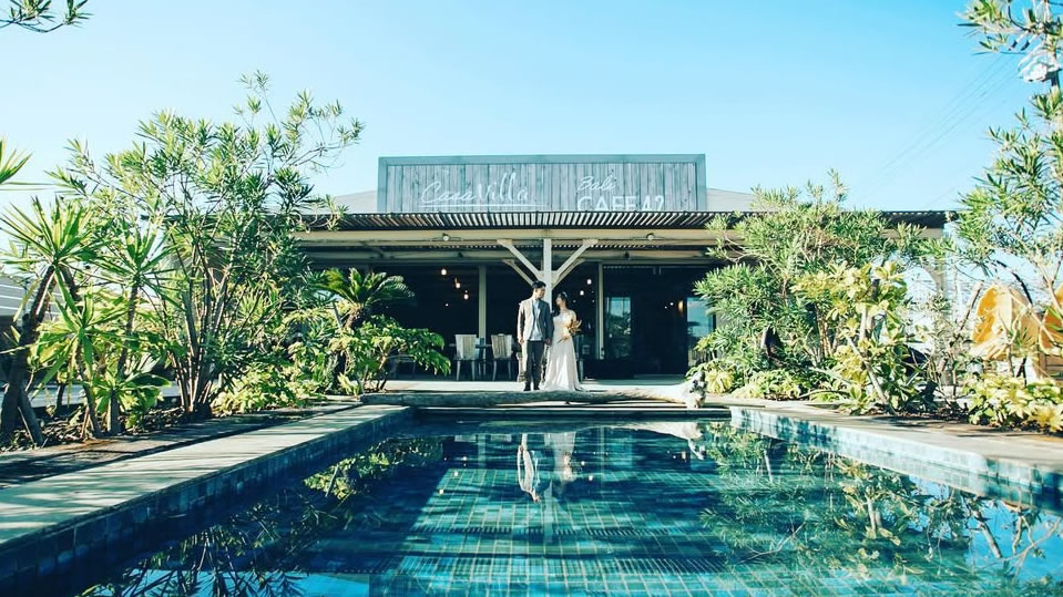 白いドレスが、プールの水面と高い空——二つの“青”にやさしく映える。光が差し込むテラス、バリ直輸入の家具が整う店内。一日一組の貸切で、ふたりの門出が特別な時間に。ここだけのリゾートウエディングを。